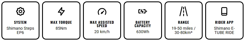 Za wsparcie elektryczne odpowiada system Shimano STEPS – lekki, a zarazem mocny silnik centralny, umieszczony nisko dla lepszego wyważenia. Oferuje trzy poziomy wspomagania, pozwalając dopasować moc do stylu jazdy oraz potrzeb związanych z zasięgiem i prędkością. Wspomaganie działa do 20 mph (w USA) lub 25 km/h (w Europie), zapewniając dynamiczną i płynną jazdę.